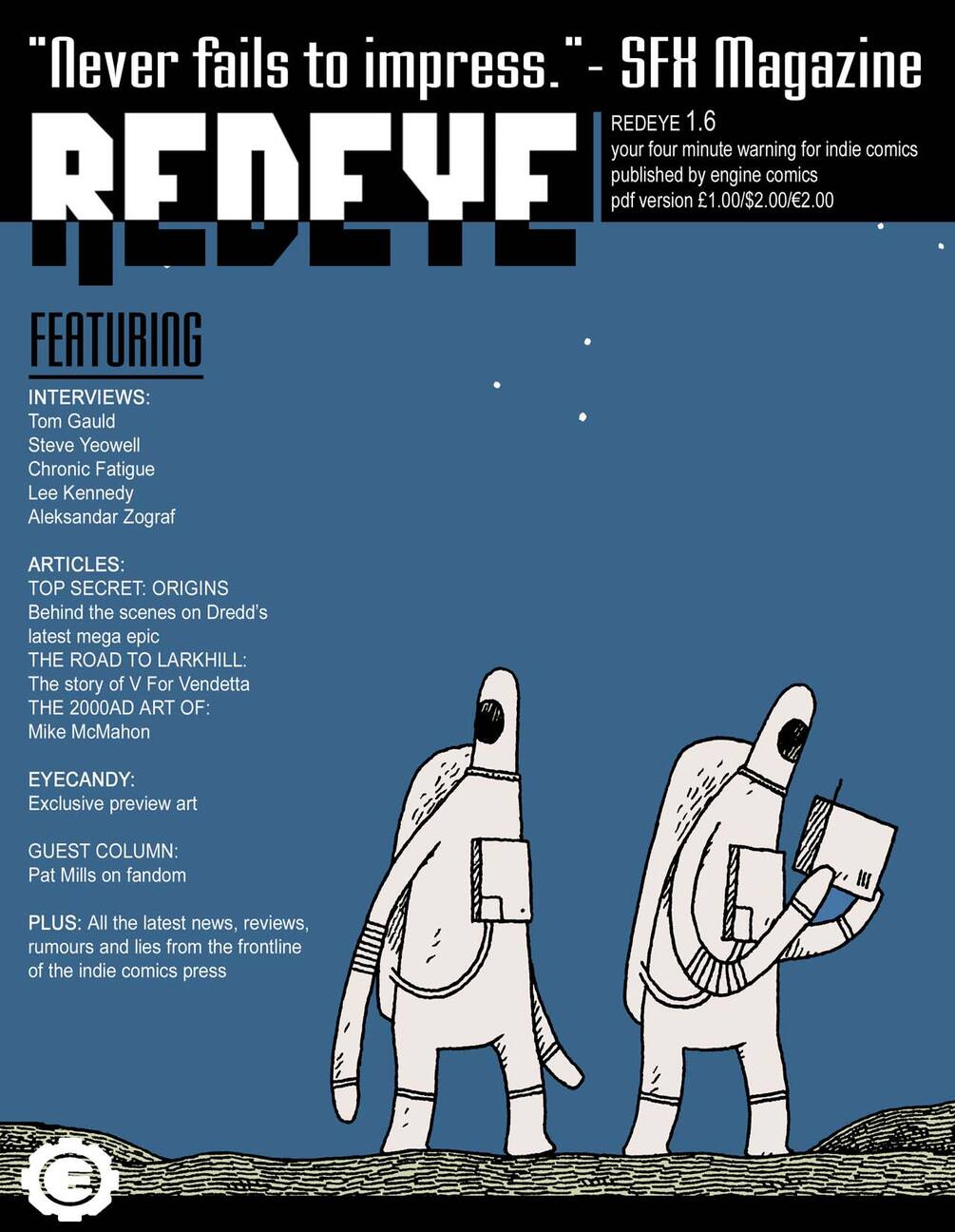 From the archives... REDEYE MAGAZINE 1.6, originally published January 2007 and long out of print, 108 pages in all its typo filled, randomly hyphenated niave glory. Featuring news, reviews, previews. PLUS: interviews with Guardian and Time Out cartoonist Tom Gauld; Inner City Pagan creator Lee Kennedy; Zenith and Invisibles artist Steve Yeowell; Windermere creator Alex C.F.; and the Judge Dredd Origins team of John Wagner, Kev Walker, Matt Smith and WR Logan. PLUS: a look at the timeline of the worlds of V For Vendetta; a retrospective on The Artist's Artist, Mike McMahon; plus a guest columns from Pat Mills, Tim Webber and Chris Atkins. PLUS - An exclusive preview of Aleksandar Zograf's graphic novel, Regards From Serbia- A Cartoonist's Diary, from Top Shelf.